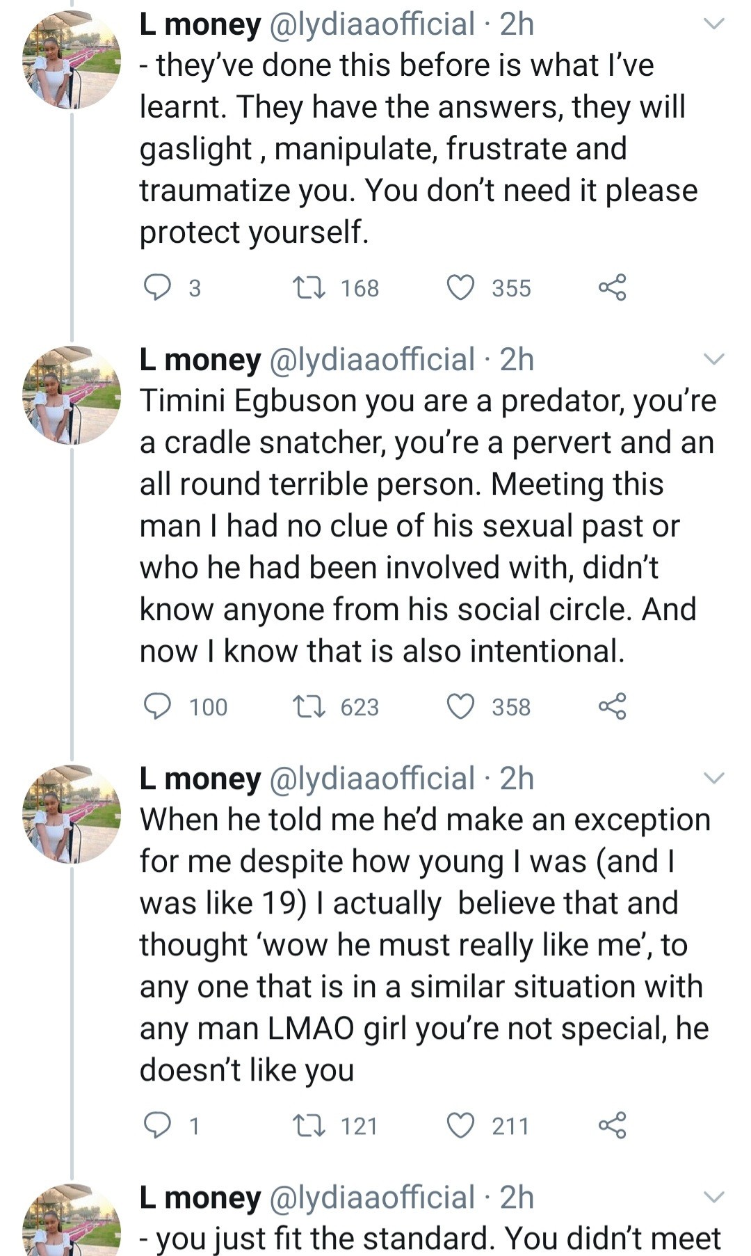 Lydia, 20, who was in a relationship with timini, 34, in 2020 took to her social media page on monday night to pen a lengthy post about their time together and the personality of the actor.